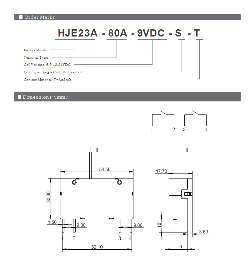 2. Для поддержания “открытого” или “закрытого” состояния реле напряжение катушки должно достигать номинального напряжения. Ширина импульса должна в 5 раз превышать время работы, чтобы обеспечить правильное изменение состояния. Не подавайте питание на оба T1, T, 2 и T3 одновременно на двойной катушке и не подавайте питание на катушку дольше 1 минуты (это может привести к повреждению катушки).